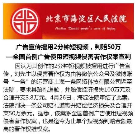 2019年4月26日,知名自媒体“一条”因擅自转载刘先生创作的短视频,用于某品牌汽车宣传,被法院判处侵权并赔偿50万。